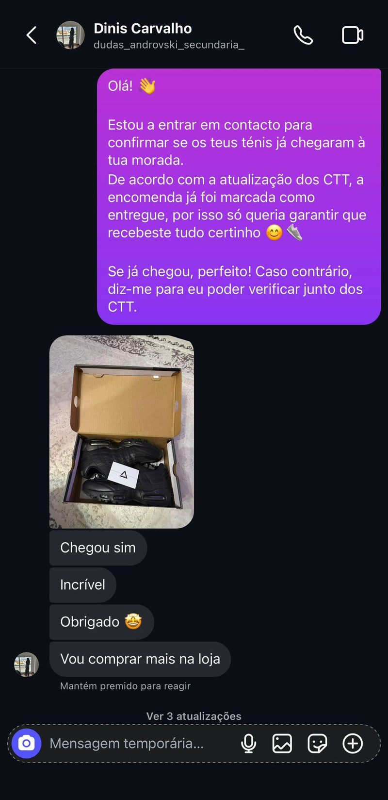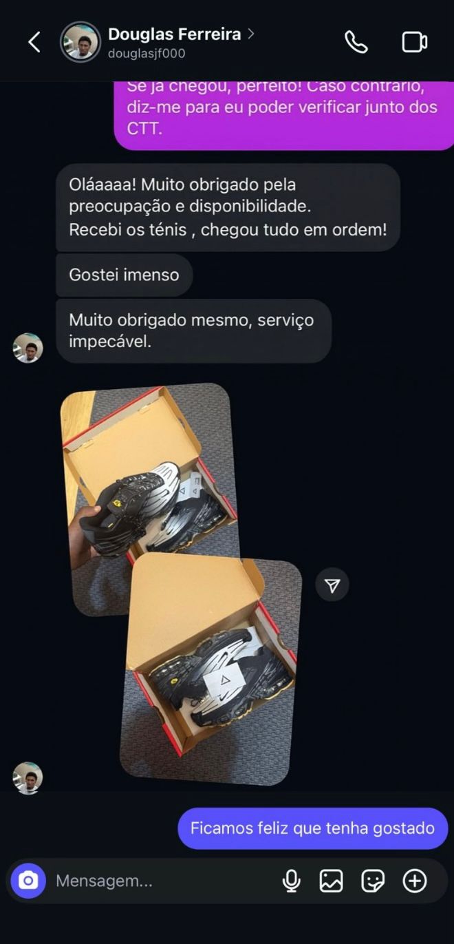 Comprei uns Nike TN e fiquei surpreendido com a qualidade muito acima do que estava à espera. Atendimento impecável, rápido e sempre disponível. Recomendo a 100%!